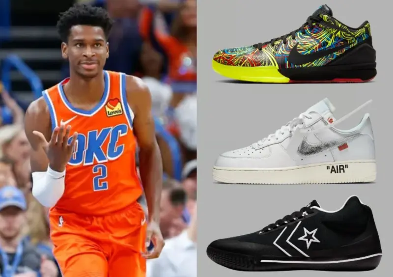 而在雷霆队时期,中早期亚历山大则经常穿搭包括 Nike Kobe 4 Protro Wizenard PE (右上), Off-White x Nike Air Force 1‘07 Complexcon (右中)以及 Converse All-Star BB Evo (右下)。