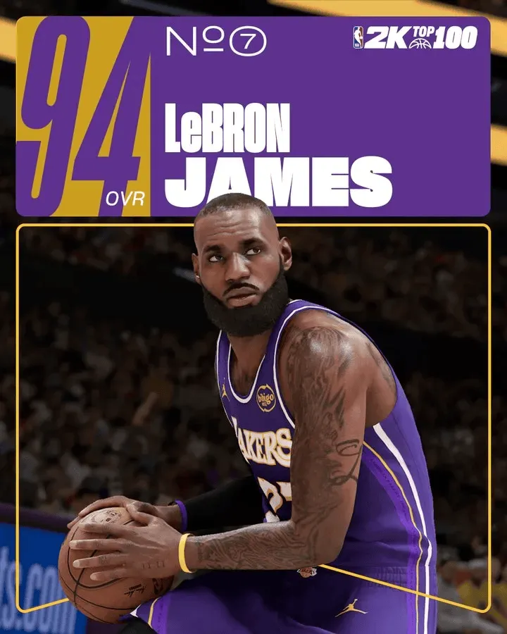 库里94排名第六、詹姆斯94排名第七、杜兰特93排名第十。